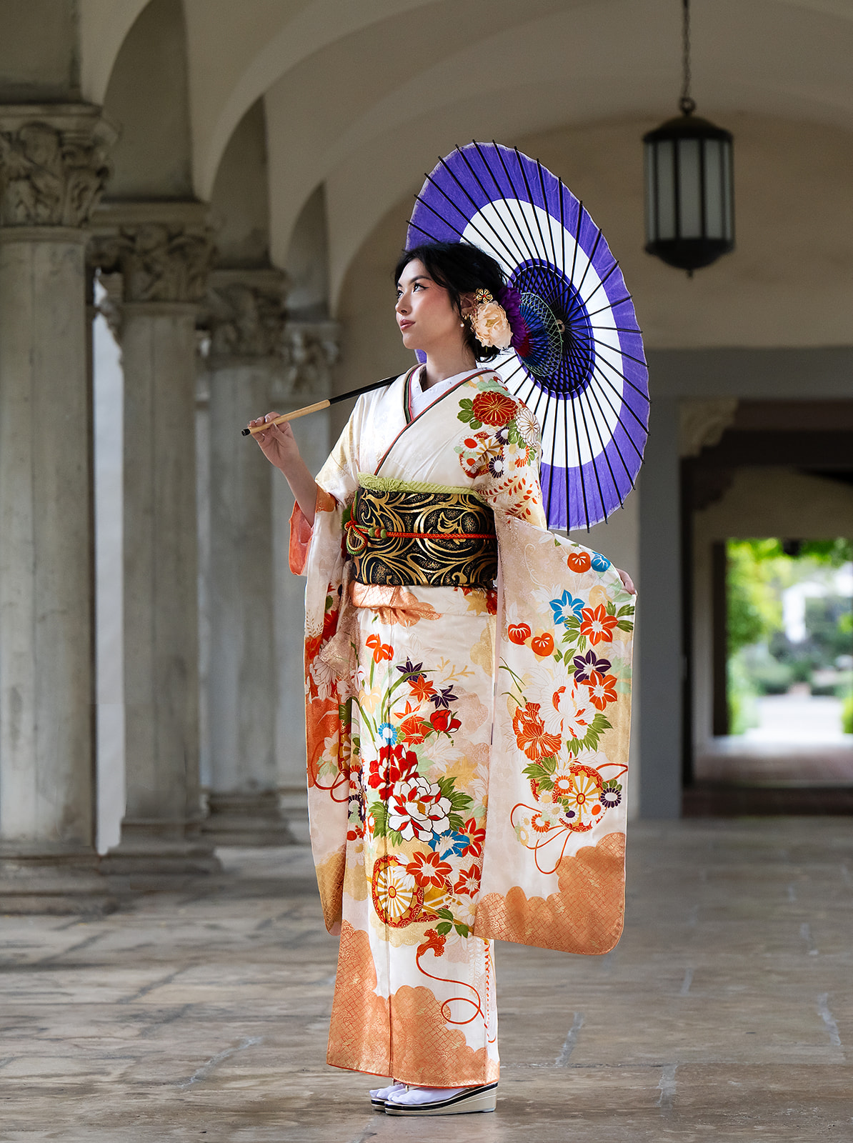 Young woman wearing a traditional kimono during her seijin photo shoot in Los Angeles